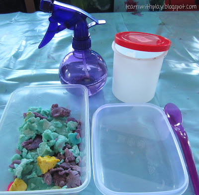 - I provided the water in a spray bottle to encourage my daughter to add the water more slowly. Had I given her a little jug of water it would have all been poured in at the very beginning and she would not have seen or experienced the play dough going through as many stages as she did. If you don't have a water bottle though, a small jug or bottle of water is fine.
