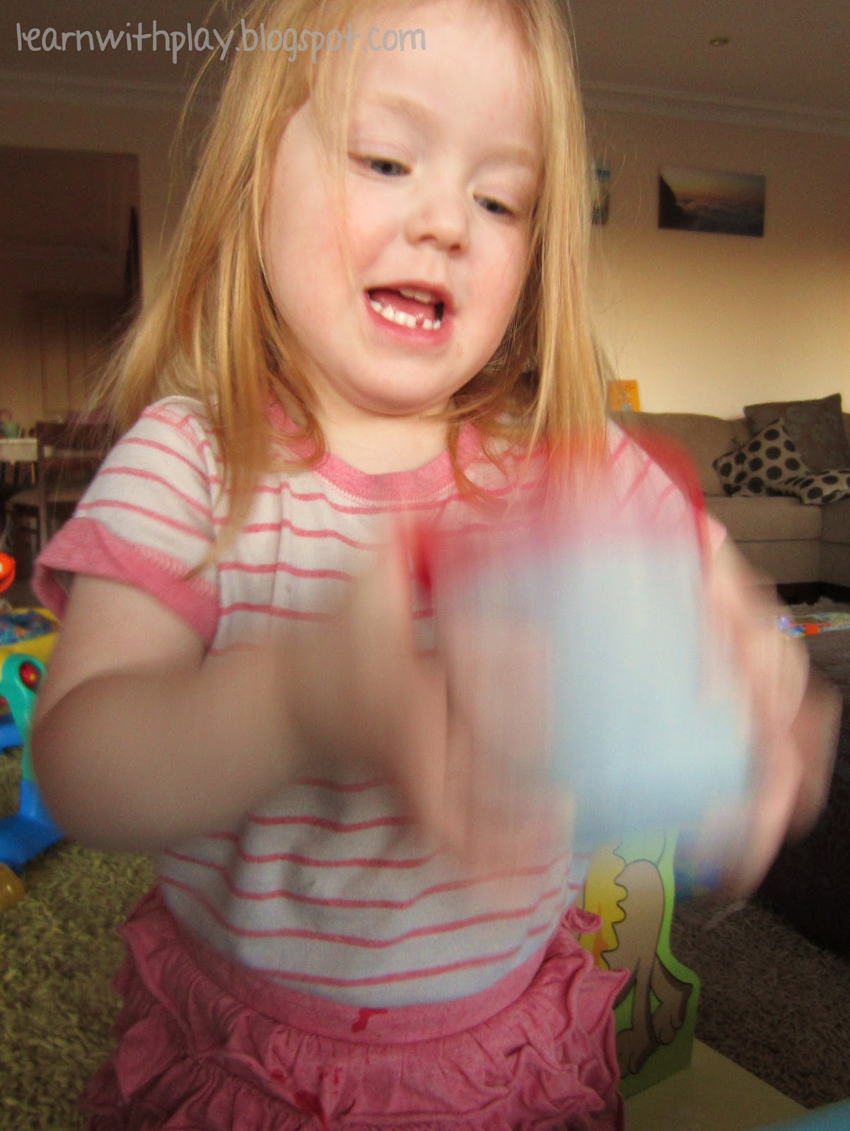 I thought she'd go for the water bottle first but it was all about transferring the dried play dough from one dish to another with the spoon.