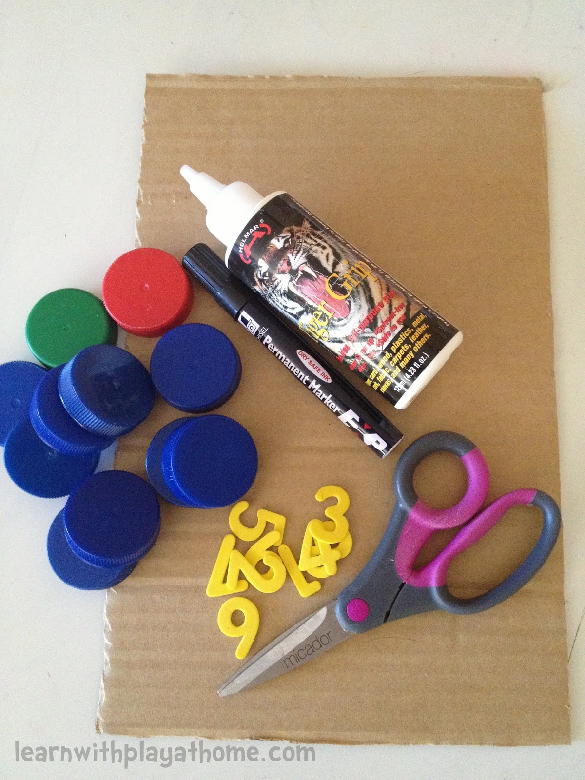 Materials: 12 Plastic Recycled Bottle Tops, a piece of thick recycled cardboard, all purpose glue, scissors, marker and foam number stickers (optional).