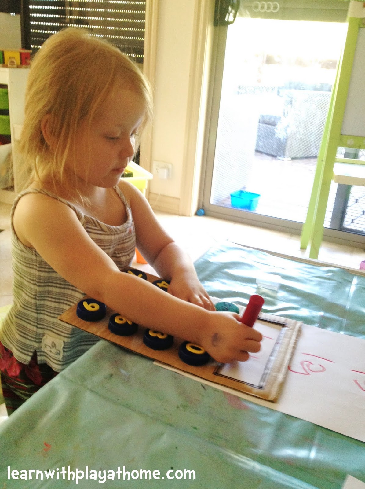 She insisted on practicing some numbers again and again. It was great having the numbers on the bottle tops so that she could copy them.